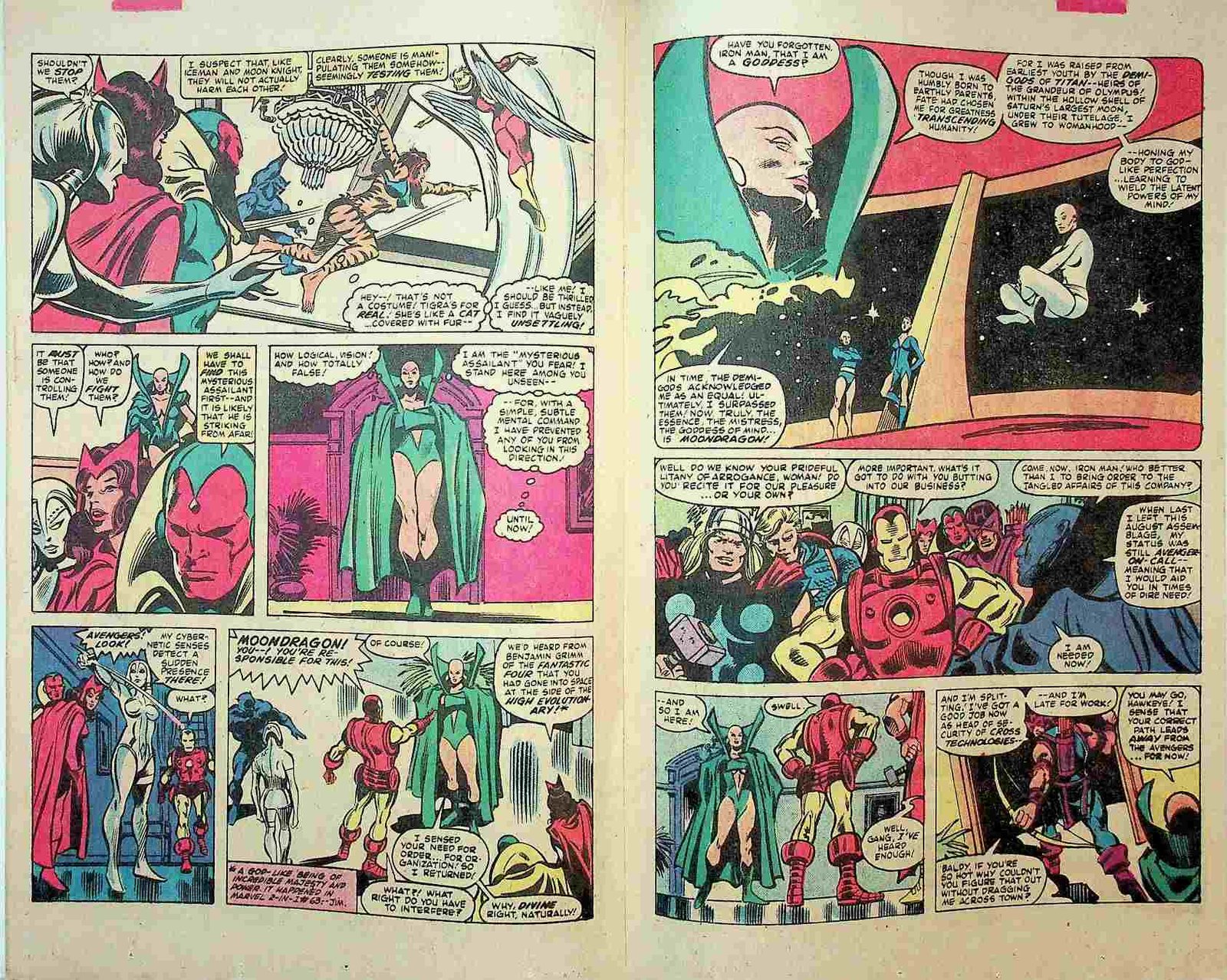 “By Force of Mind!” Guest-starring Angel, Dazzler, Hercules, Iceman, Moon Knight, and Tigra. Script by Jim Shooter. Pencils by Gene Colan. Inks by Dan Green. Cover by Gene Colan and Dan Green. Captain America declares that the Avengers must cut their active roster to six! Who will stay and who will go? Moondragon thinks she…