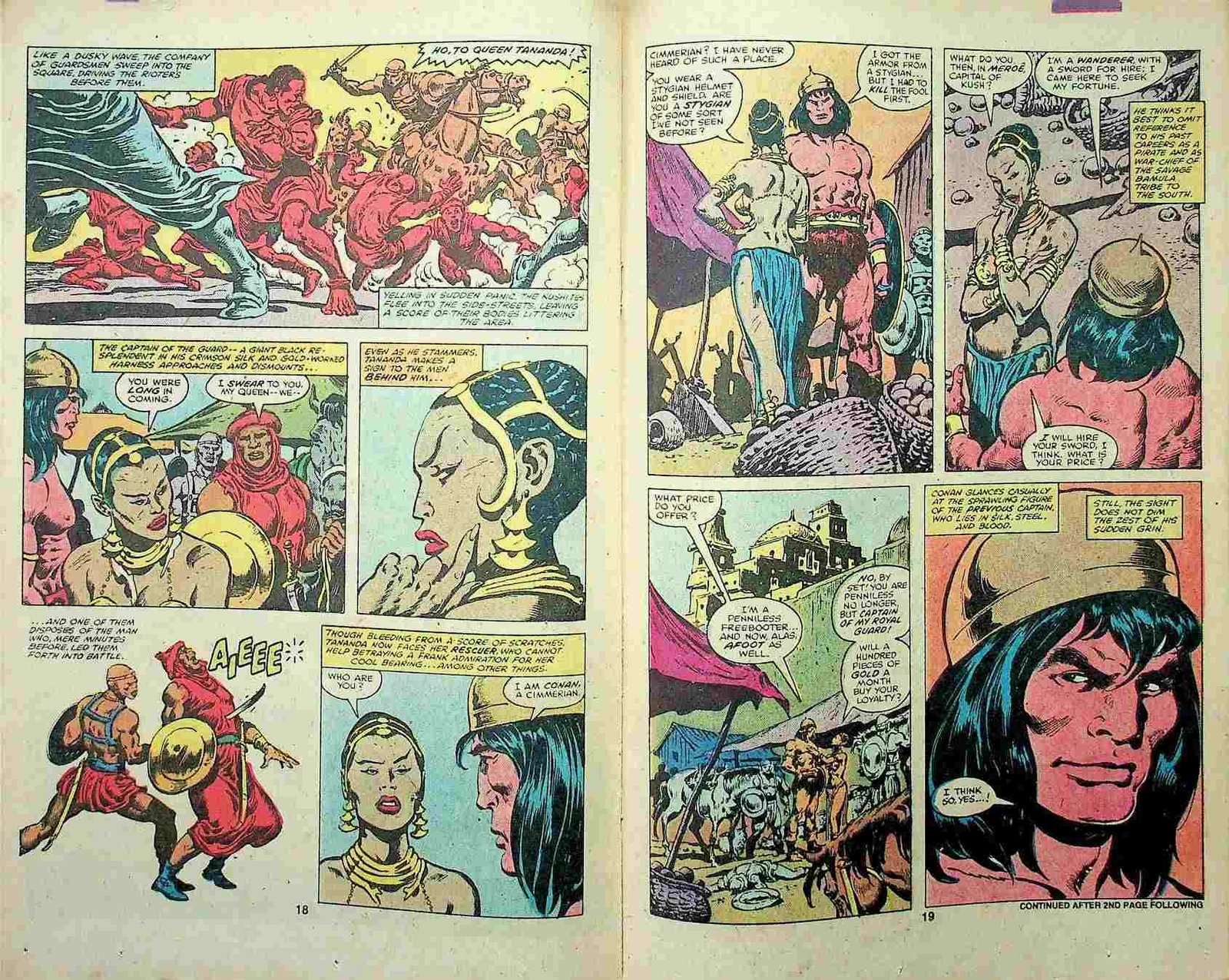 Chaos in the land Called Kush!, script by Roy Thomas, pencils by John Buscema, inks by Ernie Chan; Meroe, capital of Kush: Conan saves Queen Tananda from an angry mob and is made captain of her guards; Tuthmes uses a swine-demon to kill Amboola, he presents Diana to Queen Tananda as a slave; Conan takes…